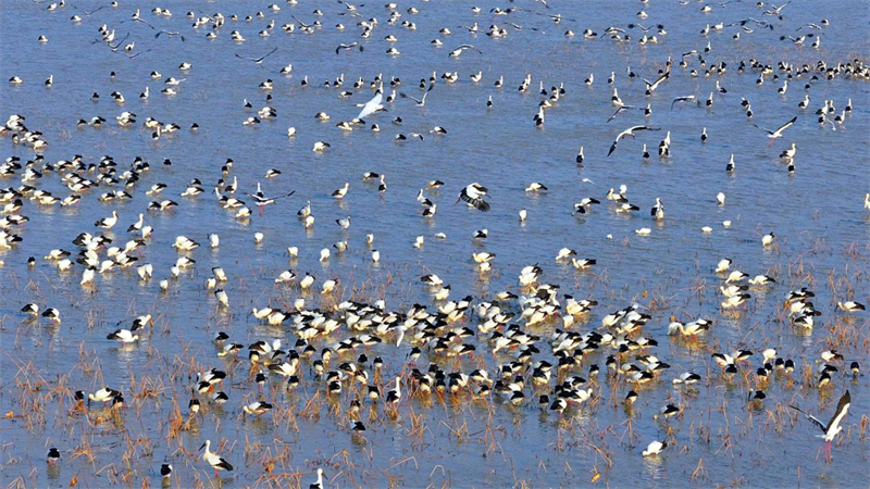 千余只东方白鹳在鄱阳湖中栖息觅食,场面壮观。 王小龙/摄